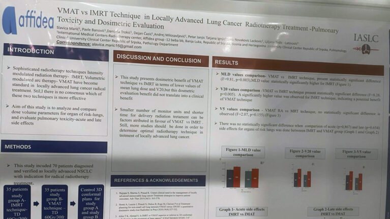 U okviru programske sesije o lokalno uznapredovalom karcinomu pluća, doc dr. med sci. Slavica Marić, radiacioni onkolog iz IMC Banja Luka, predstavila je svoj rad kroz poster prezentaciju pod nazivom:
